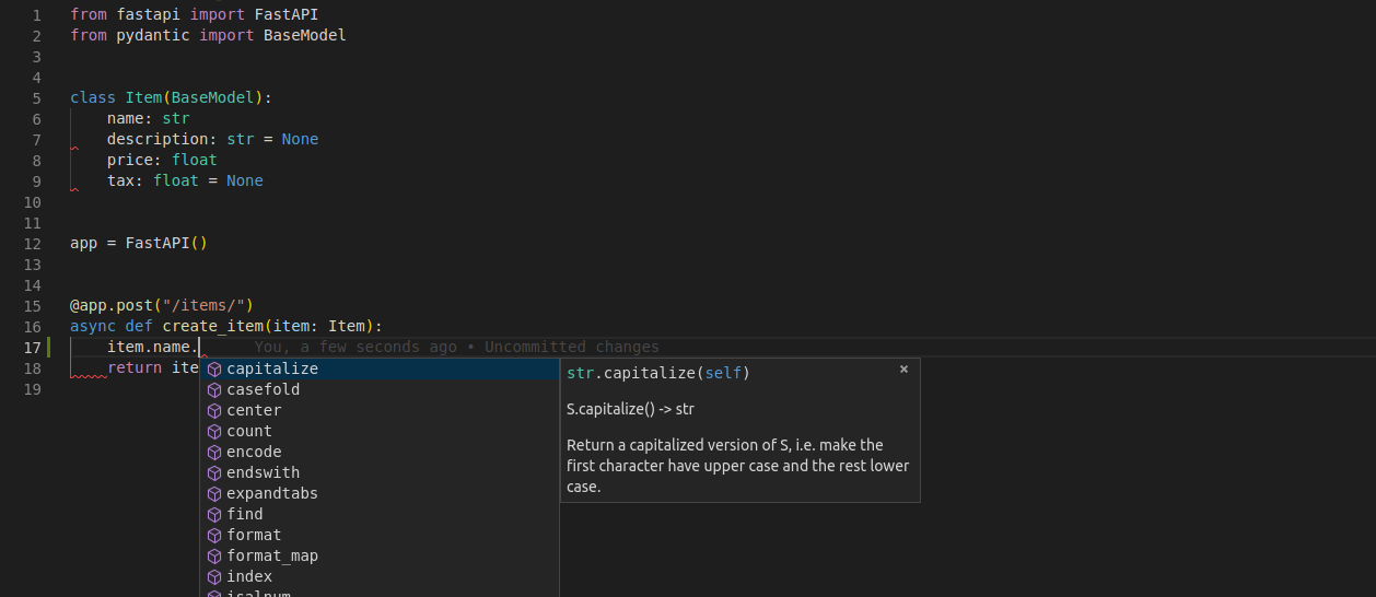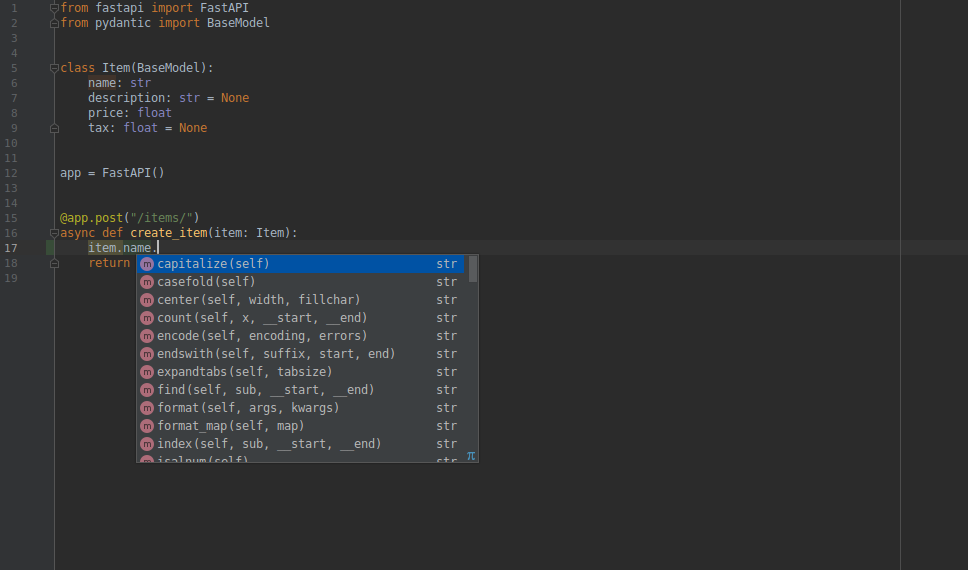 In Ihrem Editor, innerhalb Ihrer Funktion, erhalten Sie Typhinweise und Code-Vervollständigung überall (was nicht der Fall wäre, wenn Sie ein dict anstelle eines Pydantic Modells erhalten hätten):