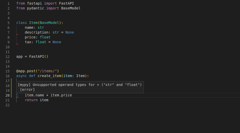 Das Union in Union[str, None] wird von FastAPI nicht verwendet, aber es erlaubt Ihrem Editor, Sie besser zu unterstützen und Fehler zu erkennen.